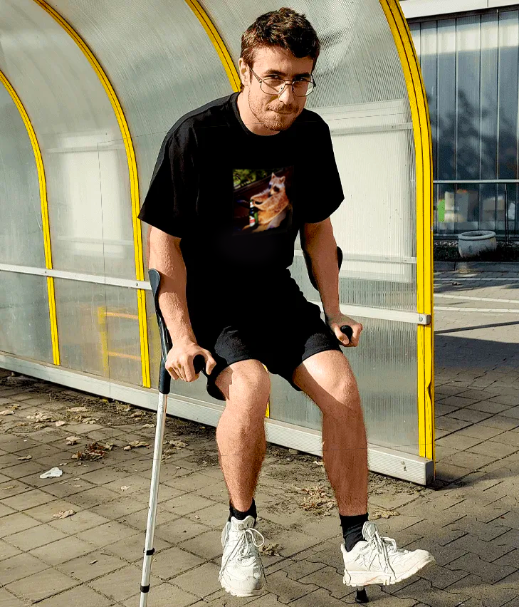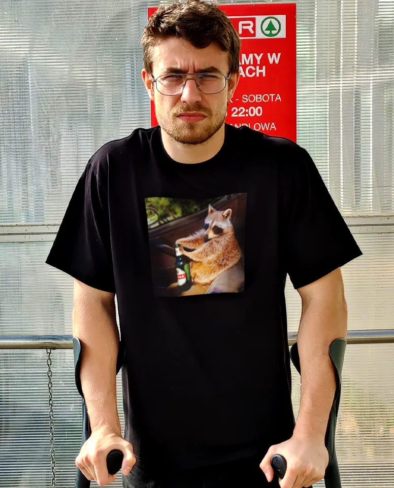 Model ma na sobie koszulkę rozmiar L (wzrost: 183cm, budowa: chudy byk, kule ortopedyczne ilość: 2)